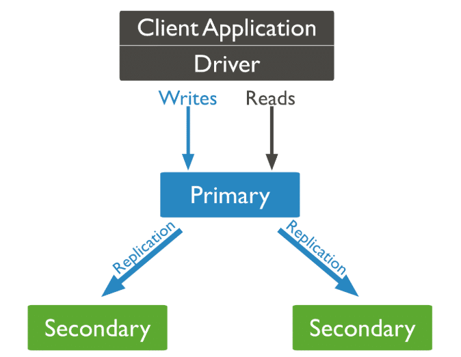 One node acts as the primary, receiving all write operations and replicating this information to the other secondary nodes: