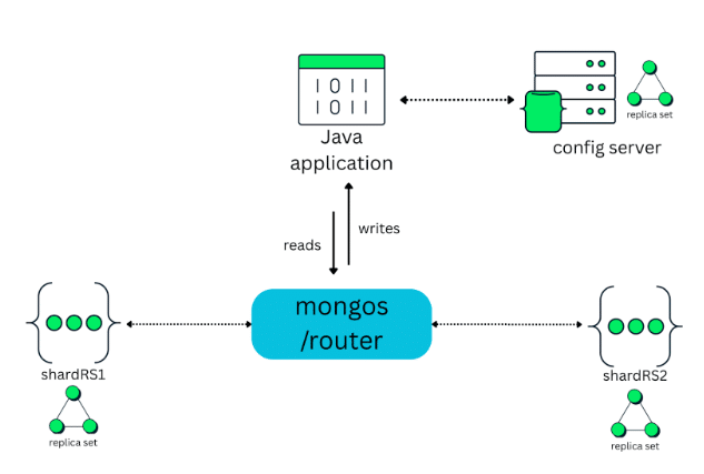 Building on top of this replication layer, a MongoDB sharded cluster is composed of three main components: mongos, config servers, and shards, as shown in the figure below: