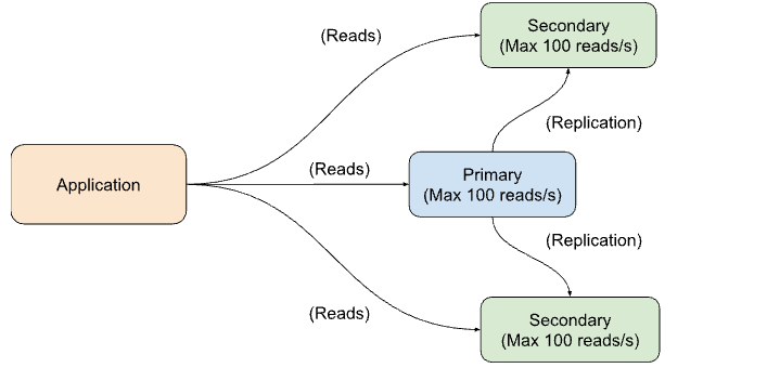 Let’s imagine we have a replica set cluster consisting of three nodes: one primary node and two secondaries. Each node can handle up to 100 read operations per second. If we distribute the read operations equally among the nodes, the entire replica set cluster should be able to accommodate a total of 300 read operations per second.