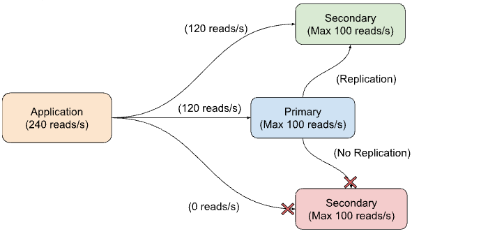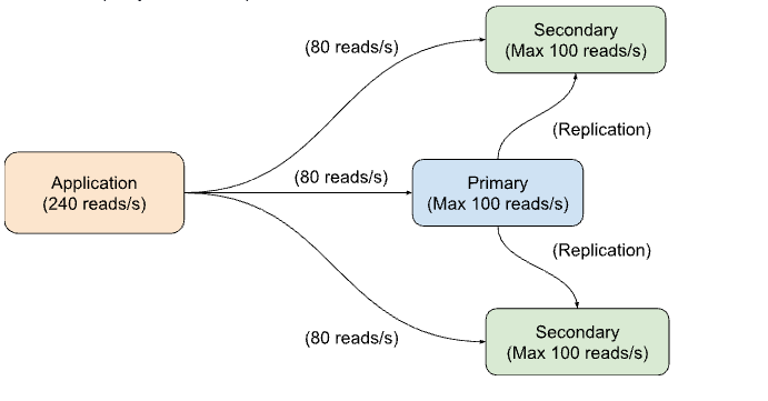 Our application requires 240 read operations per second. Since we have configured it to balance the operations across the replica set nodes, each node will handle 80 read operations per second, which is below its capacity of 100 reads per second.