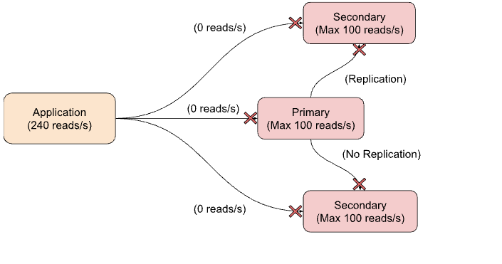 Since each node can only handle 100 read operations per second, this overloads their hardware, which may lead to further failures. As a result, the remaining nodes may go down, taking down the entire MongoDB cluster along with the application.