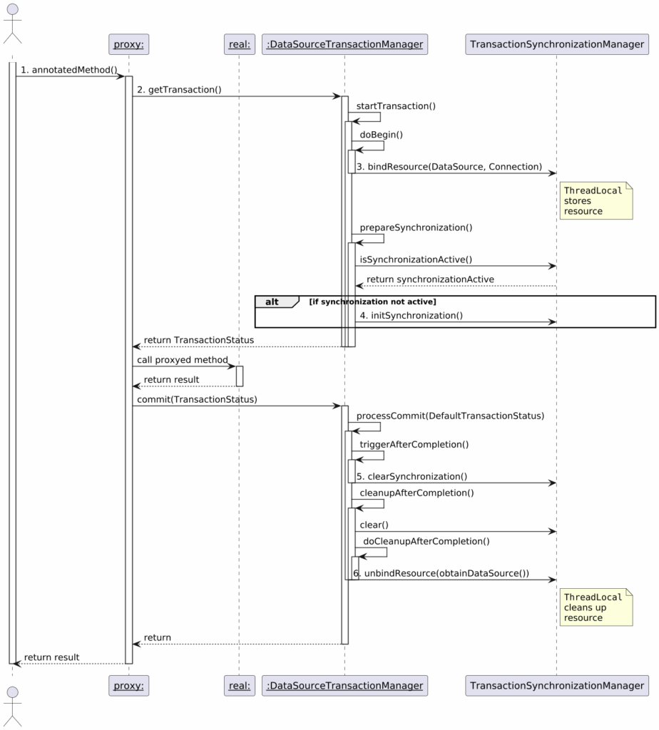 -annotated method - The proxy object gets the transaction from the concrete transaction manager, via a couple of classes, which I didn’t represent. If it doesn’t find it, it starts a new one.