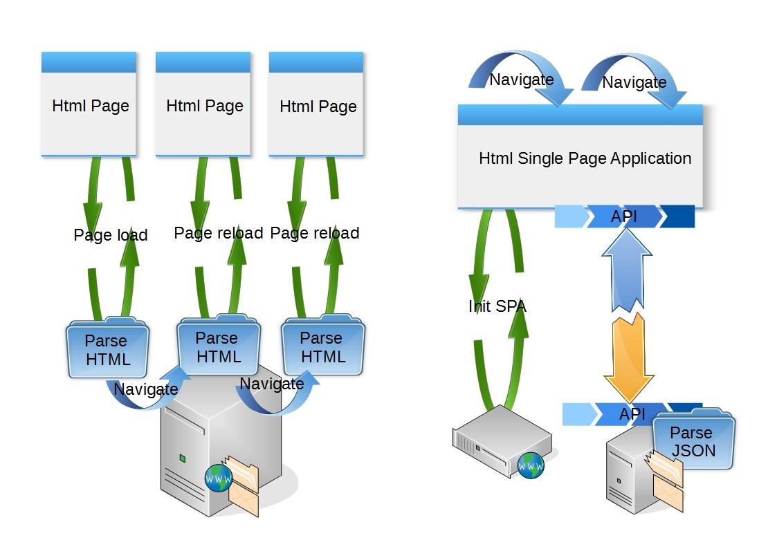 Zoals gezegd, de front-end is in de nieuwe architectuur een Single Page Application (SPA). Javascript wordt hier in niet alleen gebruikt om fancy user interface elementen te creeëren en zo de HTML wat ‘levendig’ te maken. Een SPA is een volwaardige applicatie waarin business logica is verwerkt. Deze applicatie wordt volledig ingeladen als de gebruiker voor het eerst de home page bezoekt. Hierna hoeft alleen data uit de database nog van de server gehaald te worden. De front-end is hierdoor extreem schaalbaar.