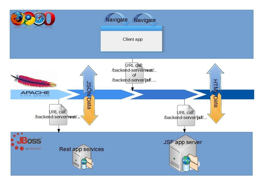 De uitdaging bij het navigeren ligt in het feit dat zowel de JSF pagina’s als de SPA vanaf hetzelfde domein geserveerd moeten worden. Hierdoor heeft de client namelijk een geldige sessie cookie om beveiligde REST calls naar de backend te doen vanuit de browser of om JSF pagina’s te raadplegen. Om dit mogelijk te maken is de Apache webserver uitgerust met rewrite rules (zie listing 1).
