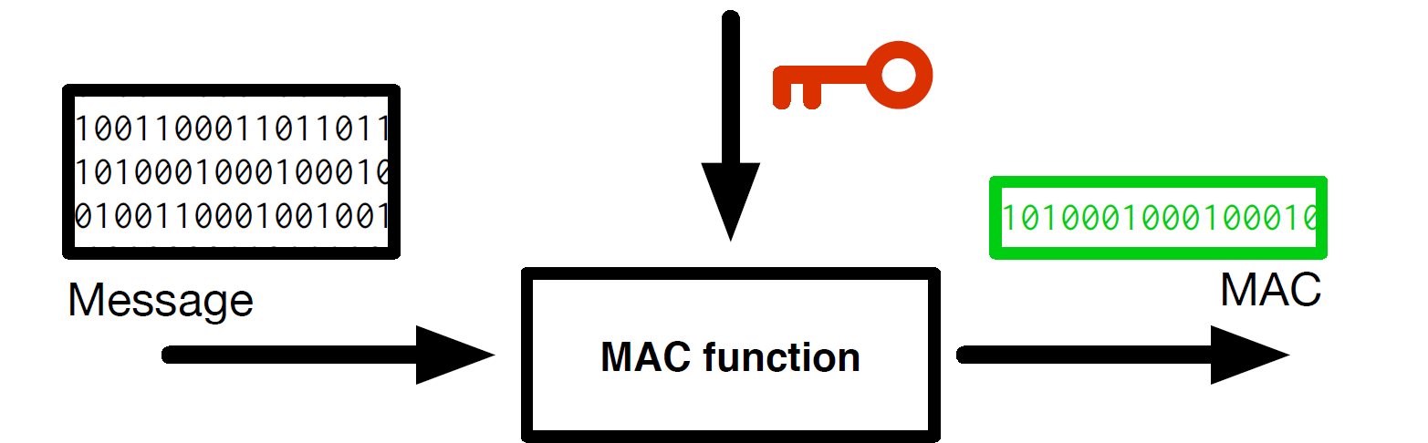 Bij een MAC wordt gebruik gemaakt van een vooraf uitgewisselde key. Verificatie gebeurt doordat de ontvanger dezelfde functie uitvoert, met dezelfde key, en de resultaten vergelijkt (Figuur 2).