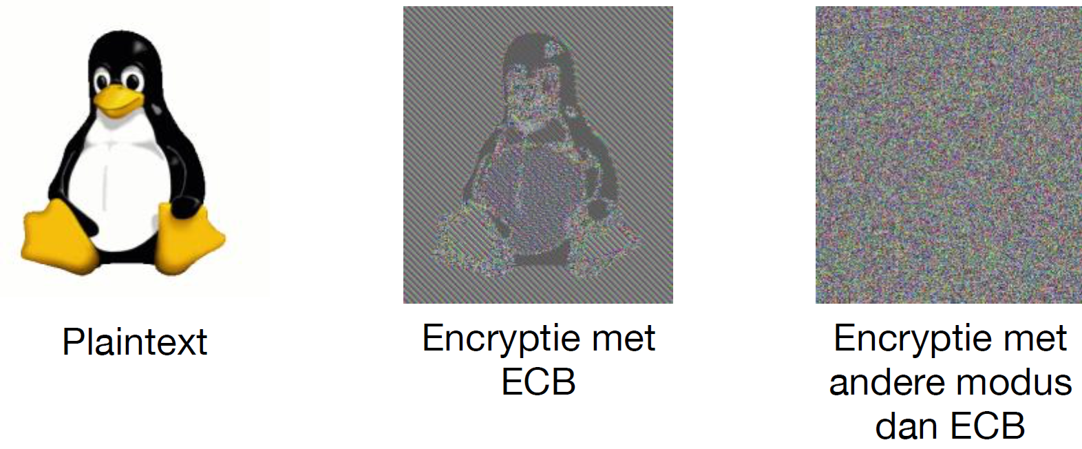 Figuur 4. Data die versleuteld wordt met ECB vertoont patronen uit de plaintext. Met één van de andere modi wordt de data teruggebracht naar ruis.
