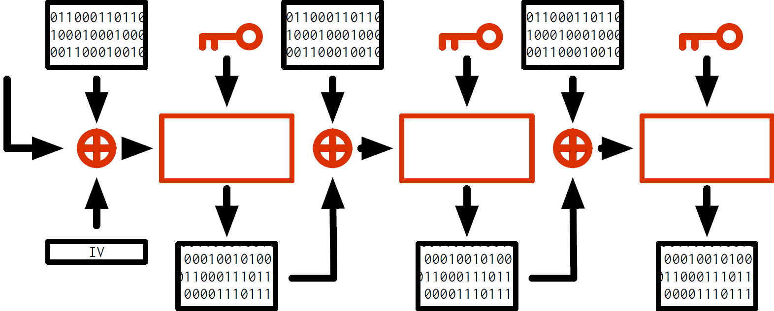 Cryptografie bestaat vaak uit het verplaatsen van het probleem, tot het handelbaar wordt. Hier hebben we zo'n punt bereikt. Op het eerste block wordt een XOR uitgevoerd met een speciale waarde, de Initialization Vector, waardoor de keten compleet is. Deze wordt vaak ergens anders in het encryptie-schema bepaald.