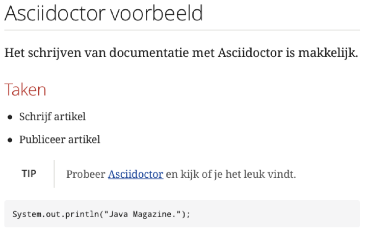 Wanneer je deze Asciidoctor markup converteert naar HTML5 dan krijg je het volgende te zien in je web browser: