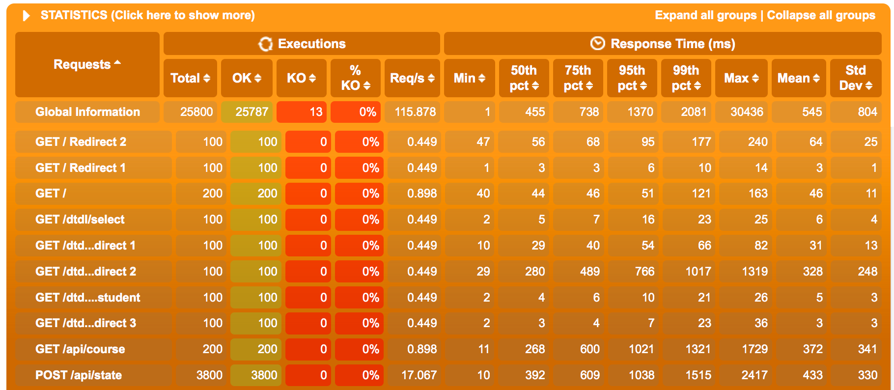 Het uitvoeren van de test doen we vanuit Jenkins CI, waarbij we een Maven job aanroepen, die Gatling start en de gegenereerde scripts uitvoert tegen een draaiende testomgeving. De test draait elke ochtend en elke avond. Om de resultaten niet te laten afhangen van het gebruik van de testomgeving gedurende de dag doen we voorafgaand aan elke test een ‘warmup’ test, die ervoor zorgt dat de applicatie al onder load heeft gestaan. Hierdoor zijn de caches gevuld, de loadbalancers opgewarmd en hebben de JVM’s voldoende geheugen gealloceerd.