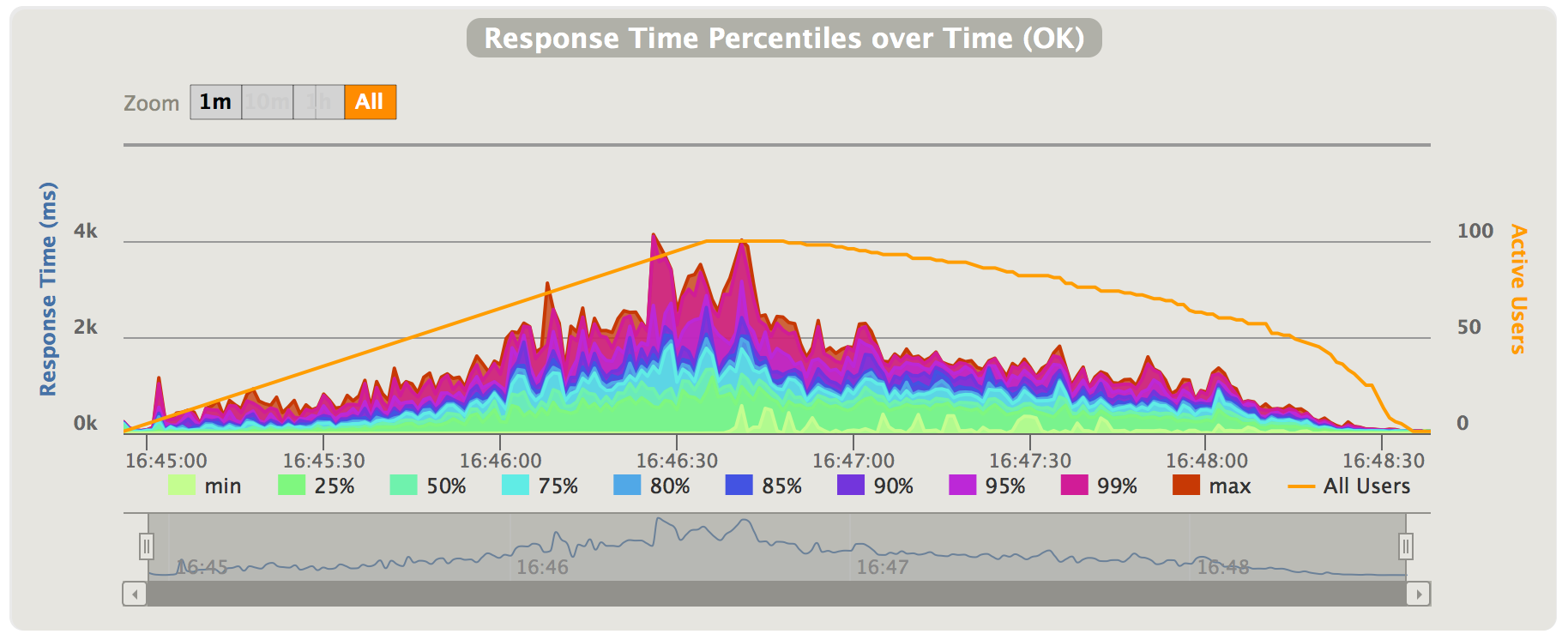 Om continue feedback op performance te verkrijgen, experimenteren we bij een klant momenteel met een opzet om performancetests mee te laten draaien op testomgevingen. Hierbij kunnen we over de tests heen een goed beeld krijgen van het verloop van de performance van de applicatie in een bepaalde periode. Dit doen we geautomatiseerd met behulp van Gatling.
