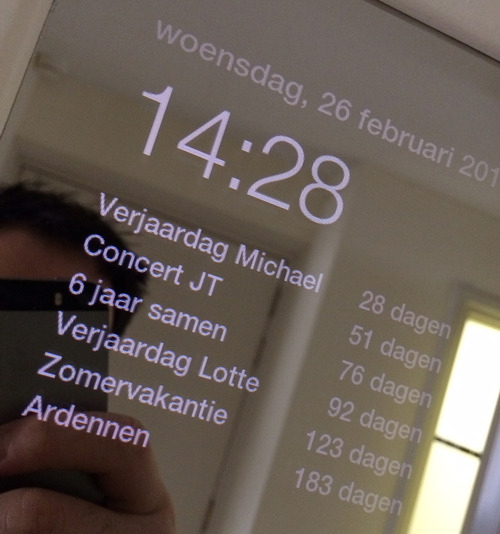 Michael Teeuw heeft de eerste versie van zijn Magic Mirror-project afgerond. Het is een interactieve spiegel waarop teksten geprojecteerd kunnen worden, bijvoorbeeld het weer of nieuws. In principe moet het zelfs mogelijk zijn om gezichten te herkennen van personen die in de spiegel kijken. De RPi zorgt voor een fullscreen browser op (of in) de spiegel waarbinnen met HTML en CSS de tekst wordt geplaatst. Zie: michaelteeuw.nl/tagged/magicmirror