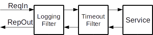 Filters en services kunnen worden samengesteld door de andThen method van Filter. Filters worden samengesteld van links naar rechts. Listing 6 laat zien hoe de logging- en timeout filter gecombineerd kunnen worden. Figuur 2 laat deze opgebouwde stack visueel zien.