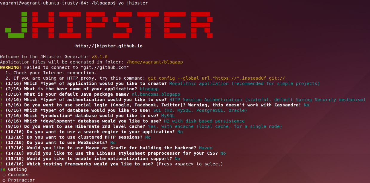 Een snelle manier om een complete ontwikkelomgeving voor Jhipster op te zetten, is door gebruik te maken van Vagrant. Hiervoor moet je wel Vagrant en Virtualbox installeren. Jhipster levert een ontwikkelbox met alle tooling die nodig is om Jhipster applicaties te ontwikkelen. Dit is aan te raden wanneer je niet de benodigde tooling hebt en snel aan de slag wilt met Jhipster. Nadat je de commando's "vagrant init jhipster/jhipster-devbox" en "vagrant up –provider virtualbox" uitgevoerd hebt, heb je een Ubuntu gebaseerde virtuele machine waarin je kunt ontwikkelen. Mocht je hier ook gebruik van maken, vergeet dan niet om in de Vagrant configuratie file in ieder geval de hoeveelheid RAM te vergroten. Rond de 3GB is voldoende om ook de Eclipse IDE binnen de virtuele machine te gebruiken.