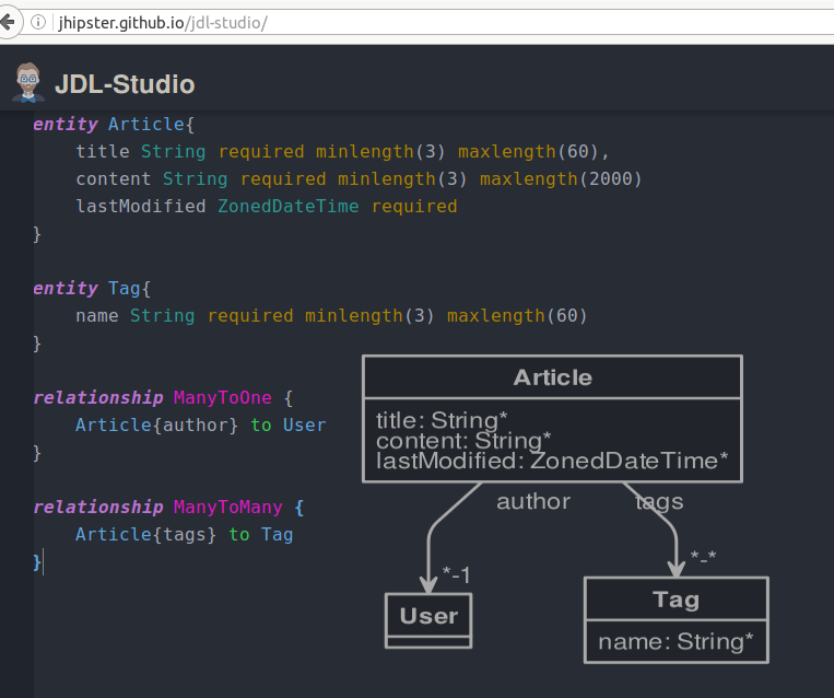 We gaan voor dit voorbeeld de commandline entity-subgenerator gebruiken. Om een entiteit te creëren, gebruiken we het commando "yo jhipster:entity <entiteitnaam>". Goed om te weten, is dat de entiteit naam gebruikt wordt als Java klasse naam, dus voor onze ‘artikel’- entiteit gebruiken we Article als naam. Dit zal resulteren in een Java klasse Article en een tabelnaam article in de database. Bij het aanmaken van een entiteit heb je de mogelijkheid om validatie regels mee te geven, die gebruiken wij dan ook. Vanuit de ‘artikel’- entiteit willen we een relatie naar de ‘gebruiker’-entiteit hebben. Deze relatie kunnen met een "manyToOne" linken aan de User. De User hebben we niet zelf gedefinieerd, maar dit is de entiteit die voor Spring Security is aangemaakt. De enige beperking bij het gebruiken van de User is dat we geen attributen aan de User toe kunnen voegen. Er kan dus alleen naar de User gelinkt worden. De relatie gebruikt standaard het id veld en je krijgt de mogelijkheid om voor de frontend een ander veld voor de view te gebruiken, in het voorbeeld gebruik we het login veld. Doen we dit niet, dan zou je als auteur van een artikel het id zien en geen naam.