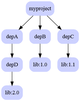 Als een project eruit ziet conform deze diagram, zal Maven voor ‘lib’ de 1.0 versie selecteren. Als lib:2.0 niet backwards compatible is, dan zal je dit project hoogstwaarschijnlijk niet kunnen uitvoeren met deze opzet. Idealiter gebruikt versie 2.0 als artifactId lib2 en heeft het een andere packagestructuur. Anders zal je via depA de package structuur moeten manipuleren via relocations met de maven-shade-plugin. Door lib:1.1 toe te voegen aan de dependencyManagement van myproject zorg je ervoor dat deze versie van lib gebruikt wordt in dit Maven project.