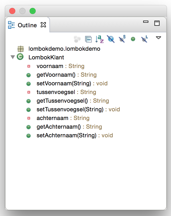 In het eerste voorbeeld zien we de @Gettter, @Setter en @NonNull annotaties in actie. De getter en setter methoden worden nu achter de schermen voor je gegenereerd tijdens compilatie. De bytecode is uiteindelijk dus echt anders dan de java code die we hier zien. In je IDE zal je dit in de outline terug kunnen zien.