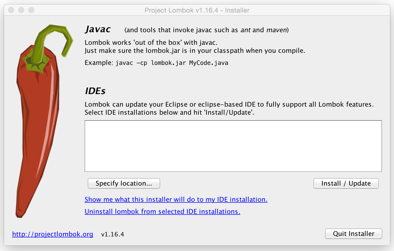 De makers van lombok hebben installatie in Eclipse vrij eenvoudig gemaakt. Je downloadt lombok.jar van de website (zie links verderop in het artikel) en voert met een dubbelklik deze executable jar uit. De installer zal vervolgens op zoek gaan naar je Eclipse installatie en de jar op de juiste plek zetten. Het kan ook met de hand. Kopieer de jar naar de eclipse installatie directory en voeg je de volgende regel aan je eclipse.ini toe: