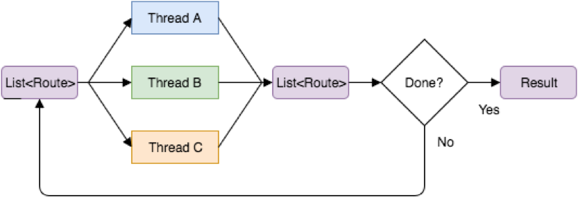 Zoals beschreven werkt het algoritme in iteraties met een top-X lijst van routes (de populatie). Als we dit op een parallelle manier willen uitvoeren, zullen we een manier moeten vinden om meerdere threads op deze lijst met routes te laten werken. We willen elke thread zelf het selecteren van ouders, recombineren van ouderparen, muteren van kinderen, maken van ‘verse’ willekeurige combinaties en evalueren, sorteren en selecteren van de nieuwe combinaties, sorteren uit laten voeren.