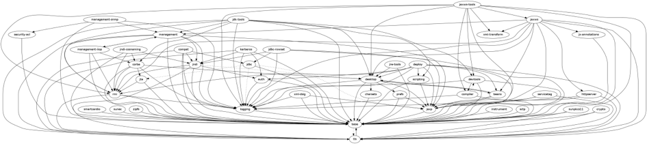 In afbeelding 2 zijn de afhankelijkheden binnen JDK7 weergegeven. De afbeelding laat de onderlinge verwevenheid van packages zien. De base-module is bijvoorbeeld afhankelijk van Logging, die weer afhankelijk is van JMX, die een afhankelijkheid heeft op JavaBeans, JNDI, RMI en CORBA. JNDI is afhankelijk van java.applet.Applet en JavaBeans van onder andere AWT en Swing. Gebruik van de Logging API introduceert een indirecte afhankelijkheid naar bijna het gehele platform.
